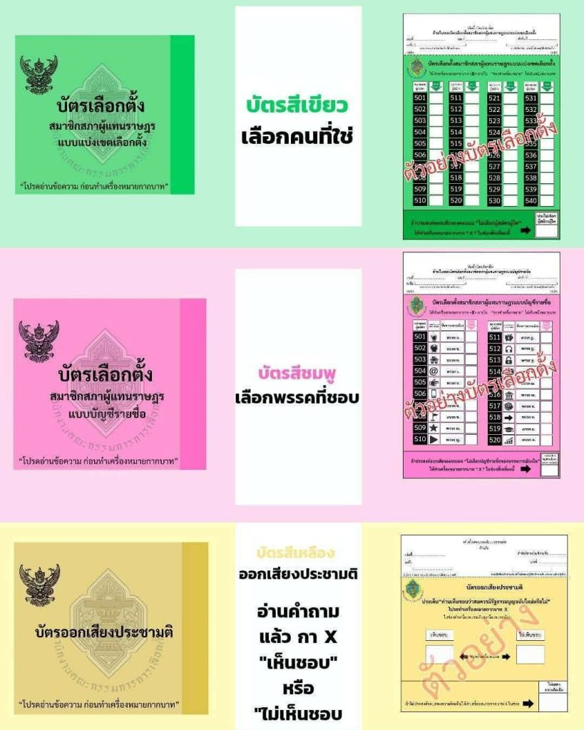 สรุปบัตรเลือกตั้ง 2569 – ไม่ต้องสับสน! วันที่ 8 กุมภาพันธ์ – เลือกตั้ง สส. + ลงประชามติ สีเขียว บัตรเลือกตั้ง สส. แบบแบ่งเขตเลือกตั้ง เลือกผู้สมัครได้ 1 คน สีชมพู บัตรเลือกตั้ง สส. แบบบัญชีรายชื่อ เลือกได้ไม่เกิน 1 พรรคการเมือง สีเหลือง บัตรออกเสียงประชามติแบบประเด็นเดียว กา เห็นด้วย/ไม่เห็นด้วย ที่มา: ข้อมูลจาก สำนักงานคณะกรรมการการเลือกตั้ง (กกต.)